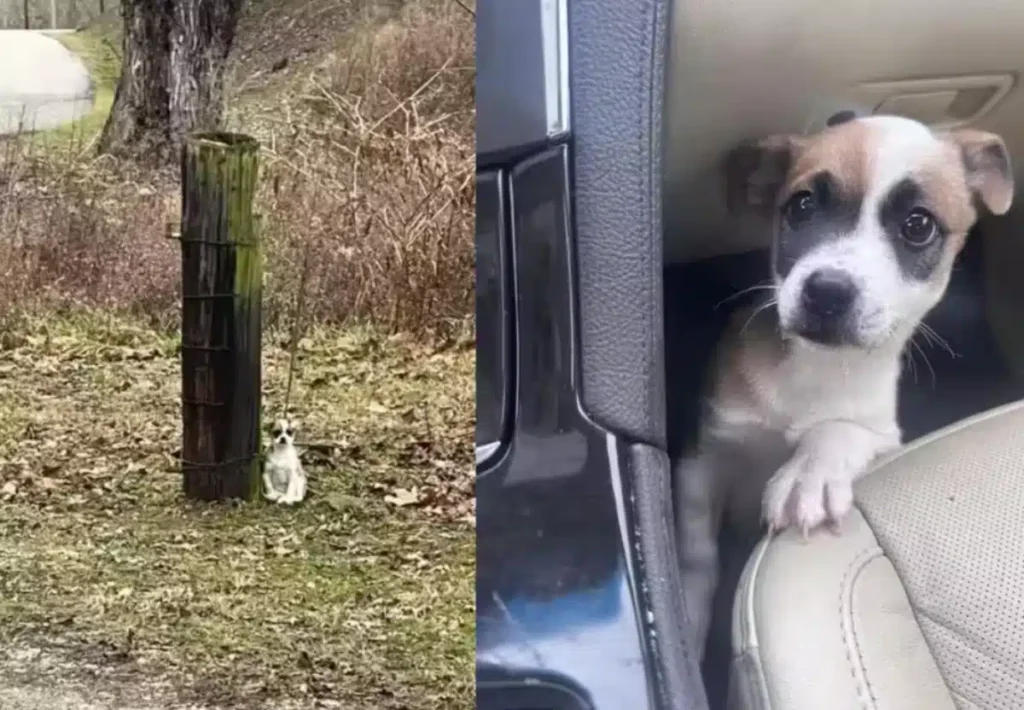 No último mês, um motorista não identificado, que dirigia por Kentucky, nos Estados Unidos, se deparou com uma cachorrinha abandonada e amarrada em um toco de madeira. Imediatamente, o motorista ligou para um abrigo local, acionando uma equipe de resgate.