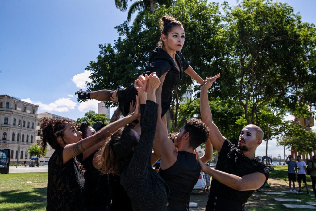 Neoral reforça que o grupo se desloca coletivamente apresentando a coreografia até um ponto específico da praça, onde se intensifica a movimentação em cena. Segundo ele, a obra é inspirada na atmosfera de grupos teatrais de rua e em coletivos mambembes, menção e homenagem a esse universo tão rico em manifestações culturais com figurinos que remetem um pouco aos traços circenses e burlescos.